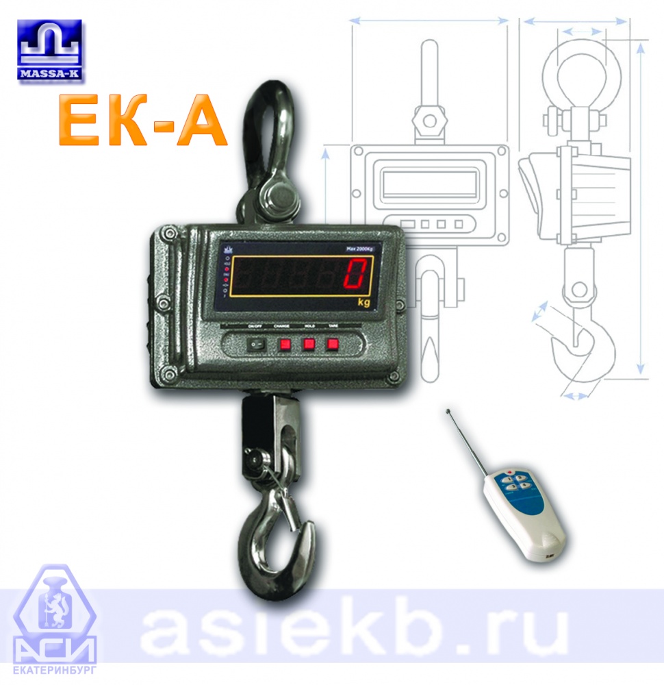 Весы модификации ЕК-А представляют собой конструкцию из грузоприемного устройства в виде крюка, корпуса с индикацией веса и с проушиной в верхней части весов, соединенная с датчиком. Особенностью крановых весов EK-А является крюк весов который вращается в вертикальной плоскости. Результаты взвешивания отображаются на корпусе весов. Пульт дистанционного управления с радиоканалом с дальностью работы до 30м без индикации. Встроенный аккумулятор обеспечивает автономную работу весов до 120 часов.