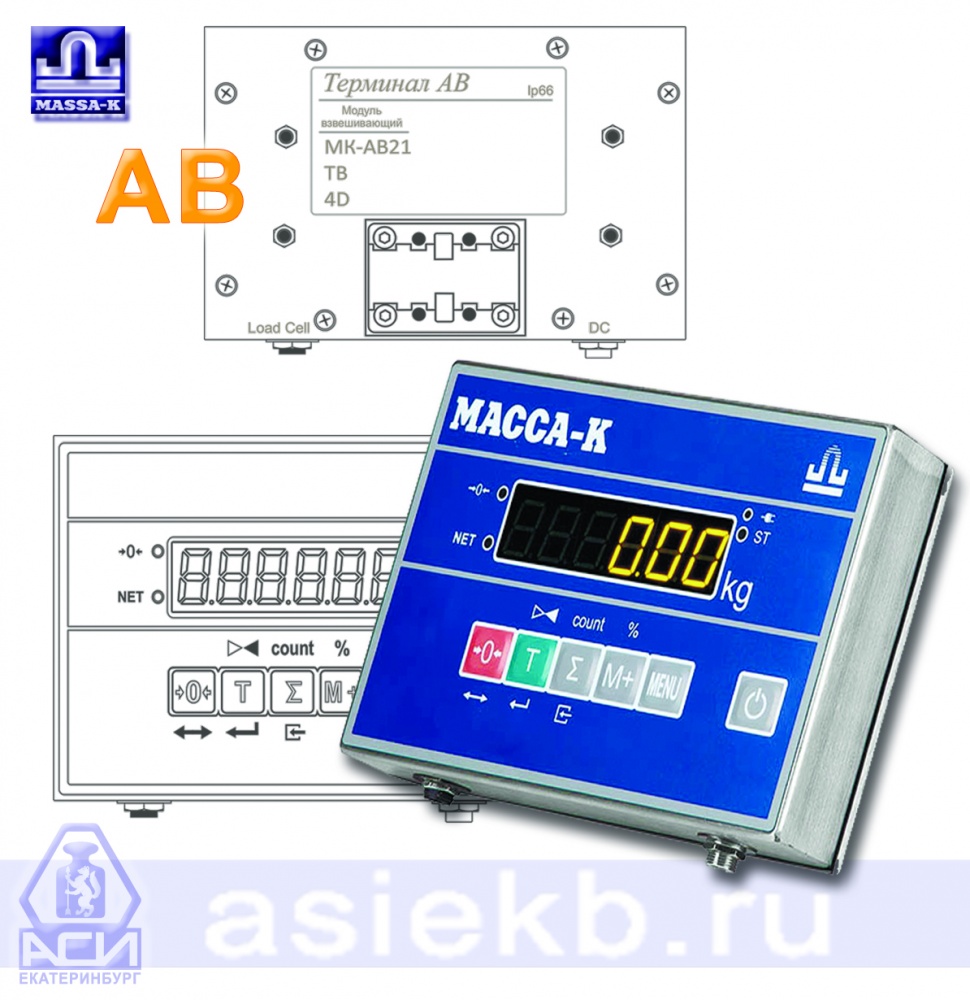 Весовой терминал АВ - в корпусе из нержавеющей стали с высокой степенью защиты IP66 и ярким светодиодным дисплеем, для работы в комплекте с весовыми платформами (взвешивающий модуль) серий МК, ТВ-S, ТВ-M и 4D изготовленных производителем "Масса-К" г. С-Петербург. Терминал подключается к модулям без каких-либо предварительных настроек и образует весы среднего класса точности.